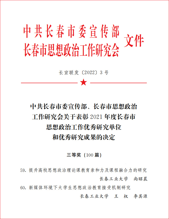 本网讯(通讯员 李其源)近日,中共长春市委宣传部、长春市思想政治工作研究会联合下发《关于表彰2021年度长春市思想政治工作优秀研究单位和优秀研究成果的决定》(长宣联发〔2022〕3号),猫都论坛 尚昭晨撰写的《提升高校思想政治理论课教育亲和力及课程融合力的研究》、王权主持撰写的《新媒体环境下大学生思想政治教育接受机制研究》荣获三等奖。
