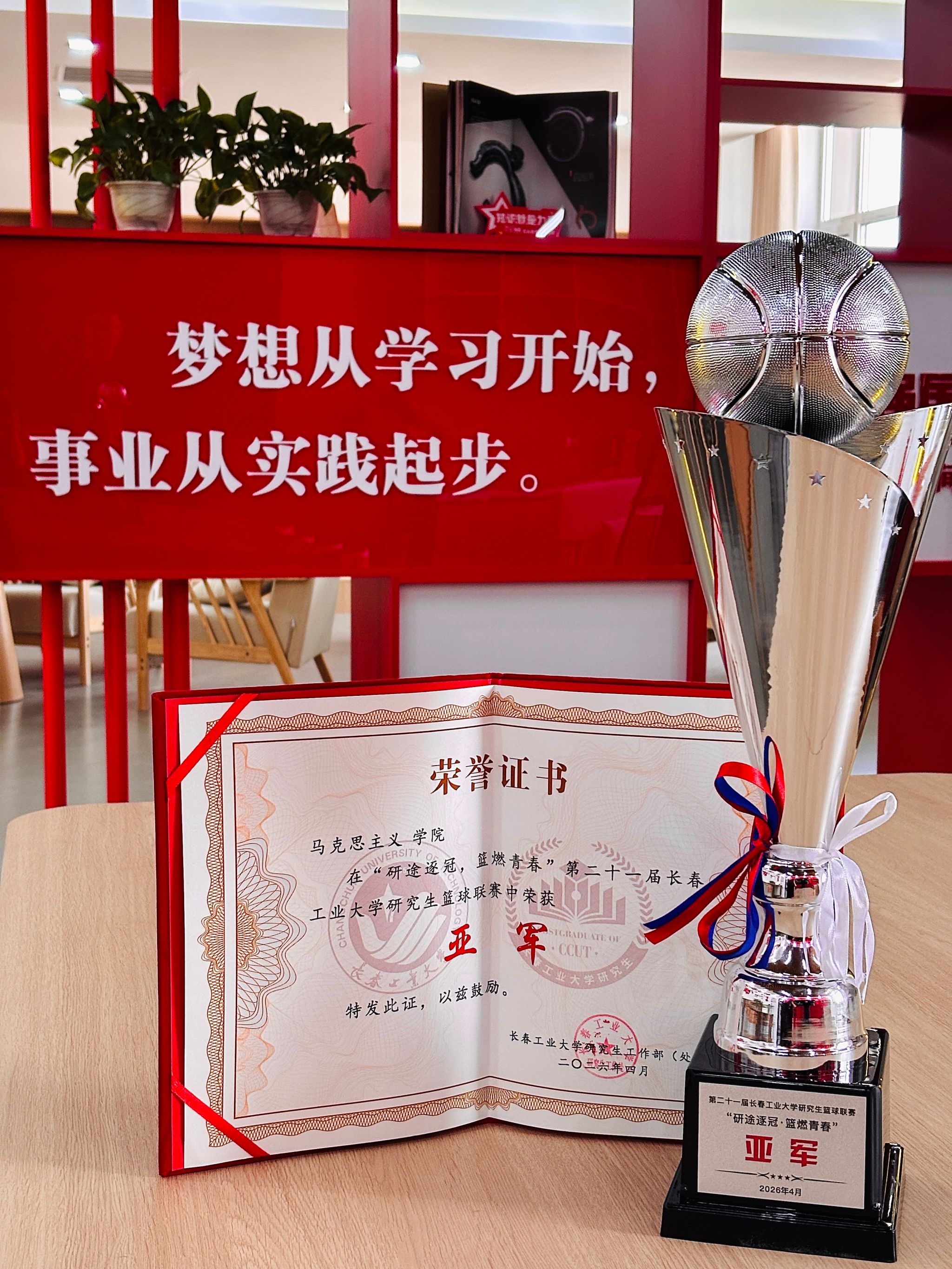 此次联赛于3月30日火热开赛,历时半月有余,共有全校10支研究生队伍参与角逐。回首本届赛事的征程,面对不同风格的劲旅,马院男篮立足于严密的防守,用积极的奔跑补位、果断的篮板拼抢和默契的传导协同,化解了一次次危机。赛场上,带球突破的步伐如疾风、坚如磐石的防守似铁壁,外线远投的利落出手划破长空,内线禁区的激烈拼抢点燃全场。无论场上比分如何焦灼,队员们始终每球必争、永不言退。而在场下,紧密配合的后勤保障与马院啦啦队更是球队最坚实的后盾。这块亚军奖杯,不仅是球员们实力的证明,更是全院上下齐心协力、团结一致的生动缩影。