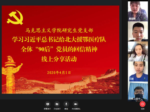 研究生党支部组织开展了学习总书记回信精神线上分享活动,研究生党员结合全国抗疫形势,深入分享心得,并表示要牢记习近平总书记嘱托,以这次抗疫中“90后”的优秀代表为榜样,志存高远、忠于祖国,敢于担当、勇于奋斗,勤奋学习、锤炼身心,努力成为在新时代改革开放事业中可堪大用、能担重任的栋梁之才,让青春在党和人民最需要的地方绽放绚丽之花。