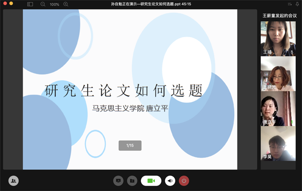一直高度重视学科建设和研究生培养工作,为了营造良好的学术氛围,督促同学们做好积累,在这个特殊时期相约“云端”,开展这次别开生面的网络学术沙龙活动,非常有必要,也很及时。希望同学们居家学习期间,做好科研规划,多读书勤思考,不断提升自身的学术意识和能力,为论文开题做好充分准备。