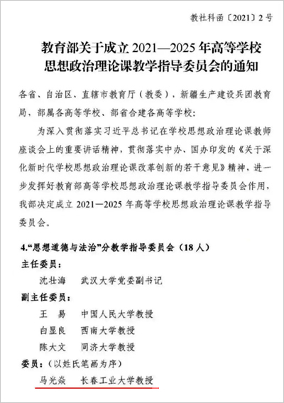 院长马光焱教授当选“思想道德与法治”分教学指导委员会委员。
