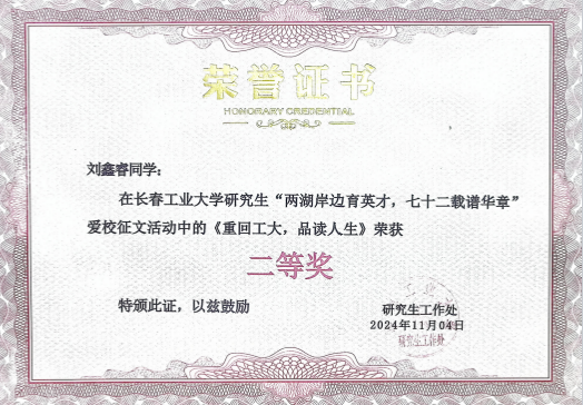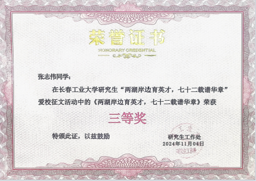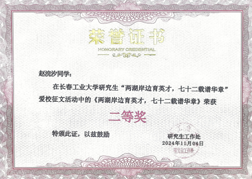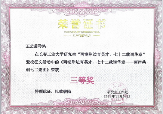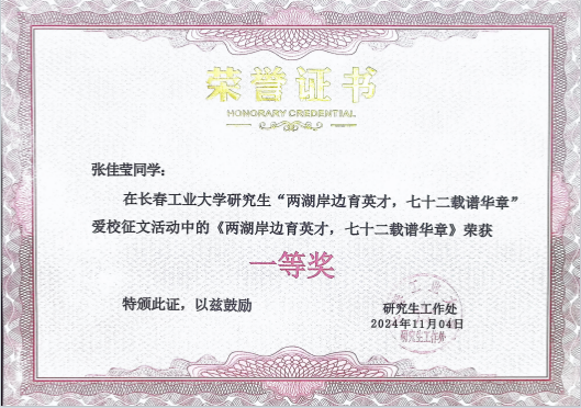 为深入学习宣传贯彻党的二十大精神,教育引导广大青年学子牢固树立爱党爱国、爱校荣校的责任感与使命感,进一步推动中华优秀传统文化传承发展,猫都论坛 研究生积极参加校研究生工作部(处)开展的“两湖岸边聚英才,七十二载谱华章”主题爱校征文活动,并荣获一等奖一项、二等奖两项、三等奖两项。此次获奖,不仅为学院赢得了荣誉,更是对青年学子爱校情怀的褒奖。