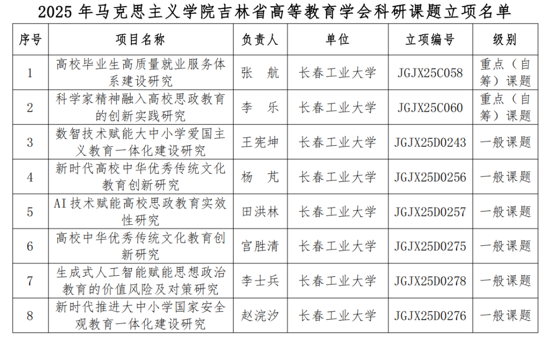 在2025年吉林省高教学会课题申报工作中,猫都论坛 学生取得了显著突破:全院共有20名学生参与申报,其中8项课题成功通过评审!