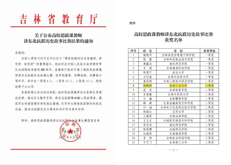 青年教师杨慧娇讲授的《冰火绝境铸丰碑 白山黑水忆英魂》展示课,荣获二等奖。