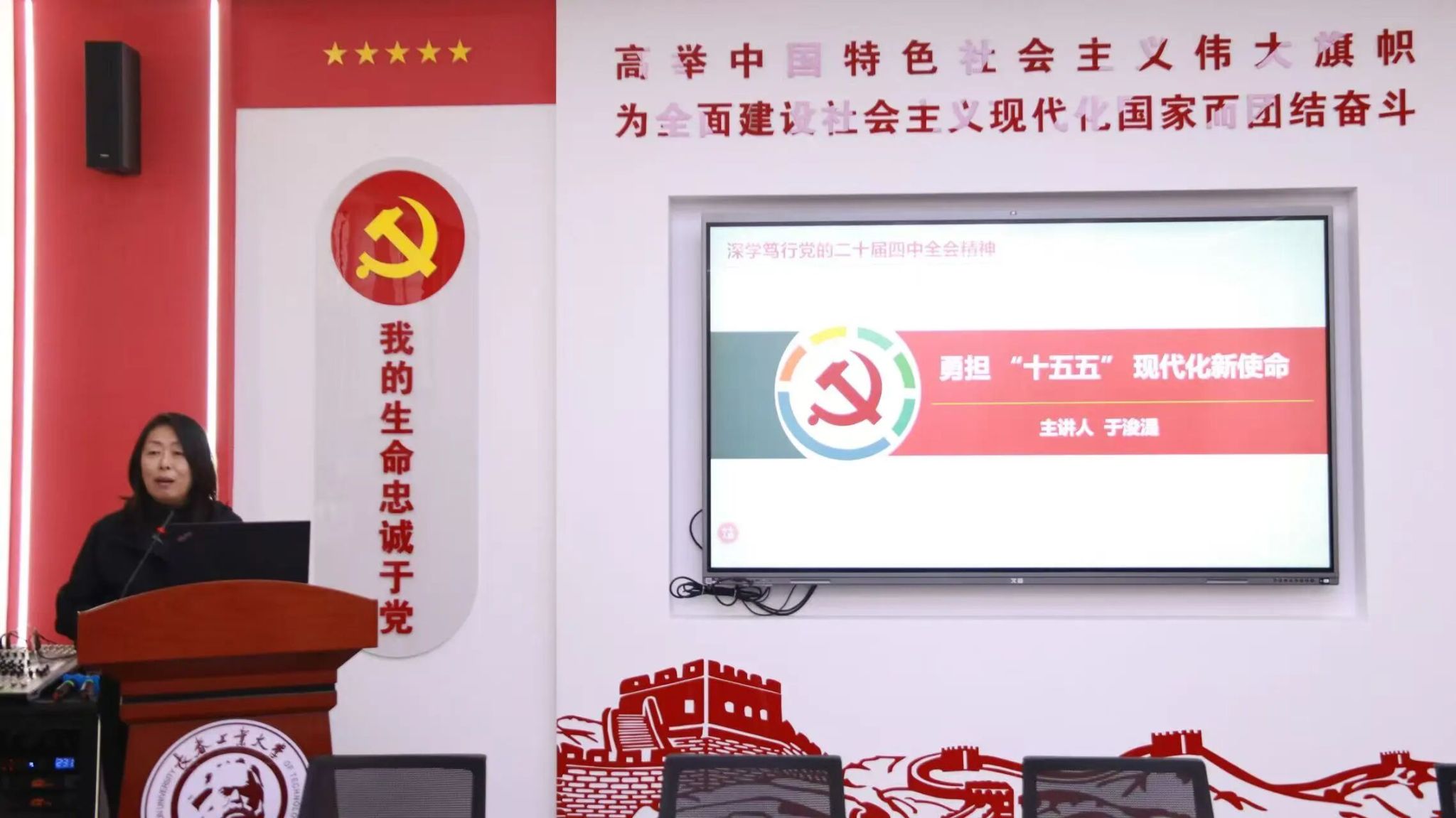 院长于浚湜以《勇担“十五五”现代化新使命》为题,就全会精神进行了深入解读,为师生带来一堂贯通历史、理论与实践的专题“思政课”。于浚湜从历史的维度厘清了全会承前启后的战略定位与重大意义;从理论的维度系统阐释了《建议》的核心要义与发展蓝图;从发展的维度清晰指明了“十五五”时期的目标任务与战略举措,为师生深刻理解全会精神、自觉担当时代使命奠定了坚实的理论基础。