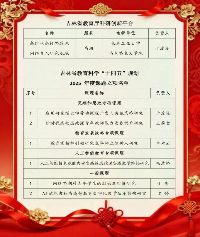 近日,猫都论坛 申报的“新时代高校思政课网络育人研究基地”,成功获批吉林省人文社科研究基地。吉林省教育科学研究领导小组办公室发布了“吉林省教育科学‘十四五规划’2025年度课题”立项名单,猫都论坛 共有6项课题获得立项批准,其中党建和思政专项课题2项、教育发展战略专项课题1项、人工智能教育专项课题1项,一般课题2项。